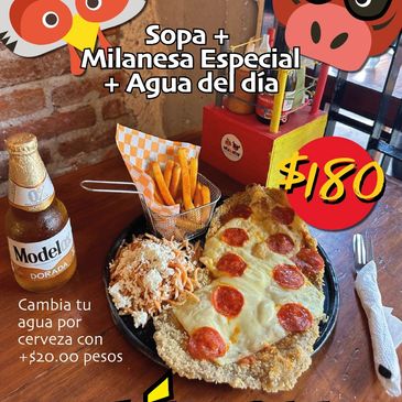 Sopa + Milanesa Especial + Agua del día por solo $180.